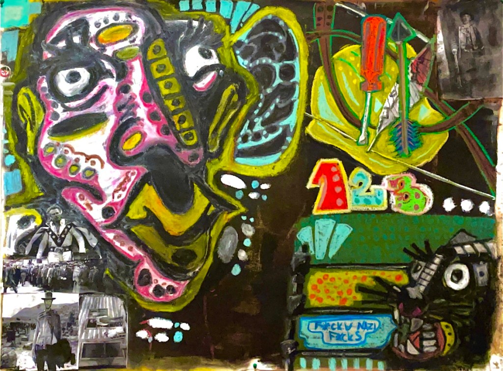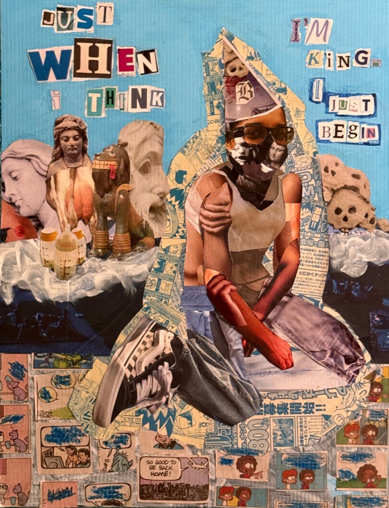 Description: “This painting was inspired by my frustration with the recent election and the growing disconnect between the government and working-class people like the writers, construction workers, and plumbers. I wanted to convey my feelings creatively while staying true to my style. I experimented with collage and oil sticks, adding energy and texture to the piece.