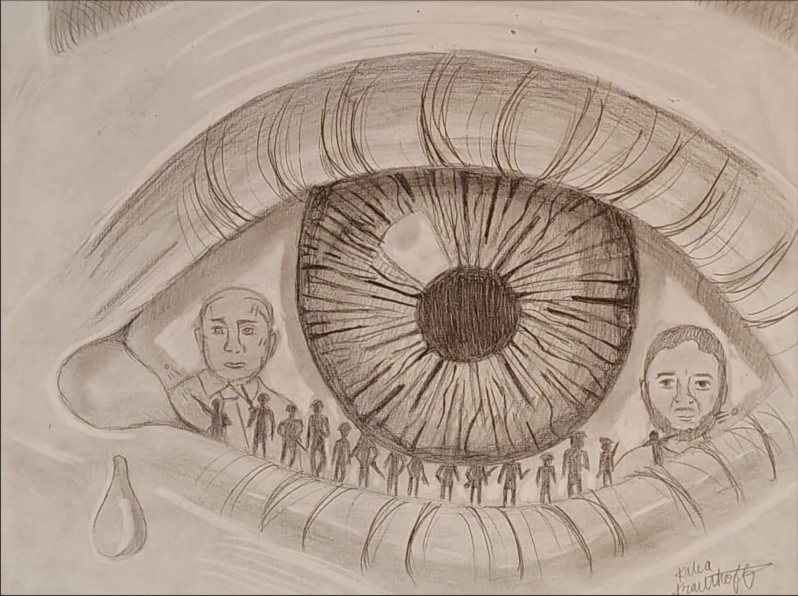 Description: “This surrealist piece is inspired by the war in Ukraine. The color is all gray to represent the loss and hardship during such an unfortunate time. On the right Zelenskyy is depicted and on the left Putin is shown.